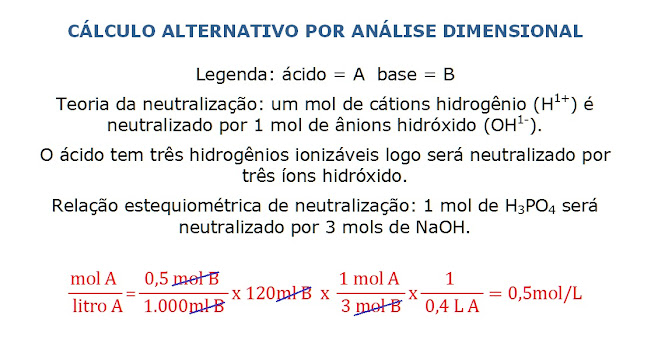 01) Determine a concentração molar (mol/L) de uma solução aquosa de ácido fosfórico, sabendo-se que 40 centímetros cúbicos desta solução neutralizam 120 centímetros cúbicos de solução aquosa 0,5 mol/L de hidróxido de sódio.